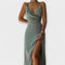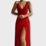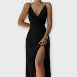 İnce askılı bu uzun elbise, drapeli yakası ve cesur yırtmaç detayıyla akıcı bir kesimi bir araya getirerek özgüven ve sofistike bir hava sunar. Minimalist tasarımı silueti zarifçe vurgularken, yumuşak kumaşı lüks ve rahat bir his verir.