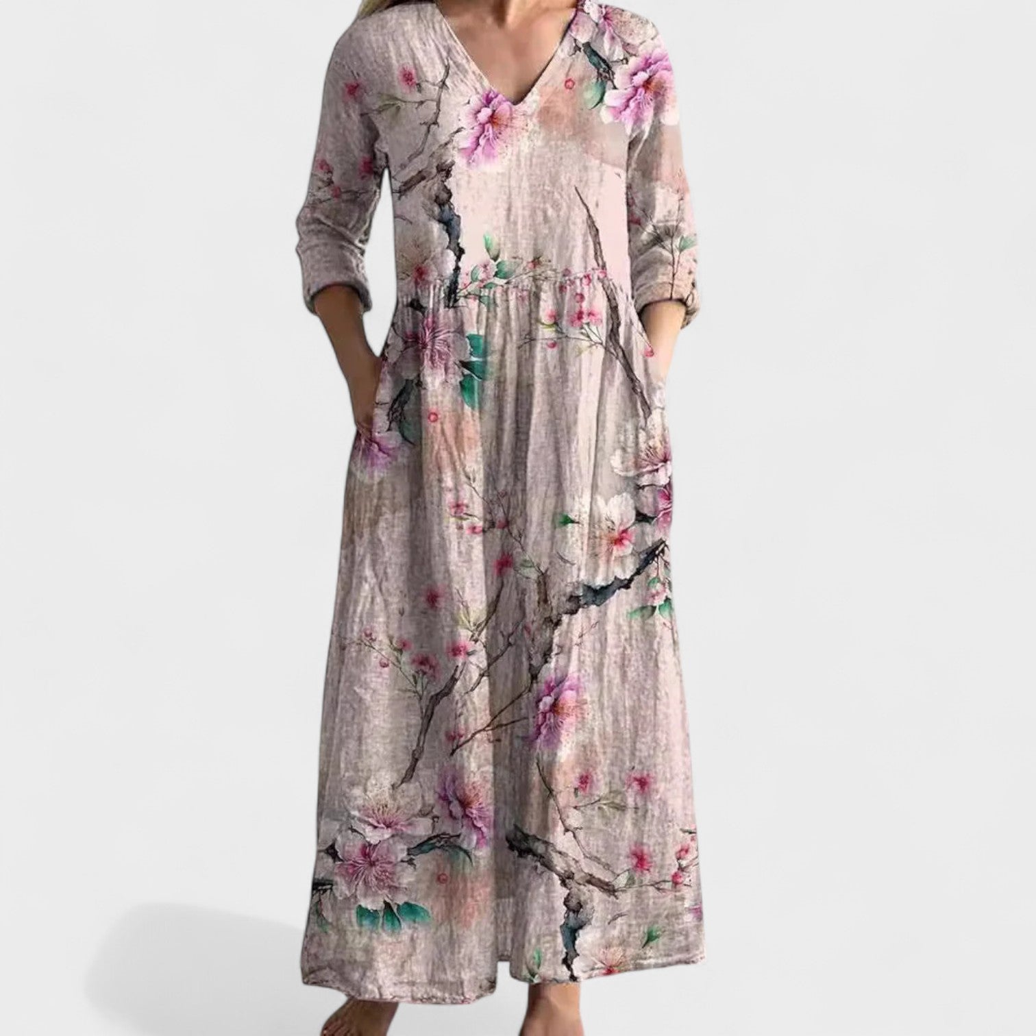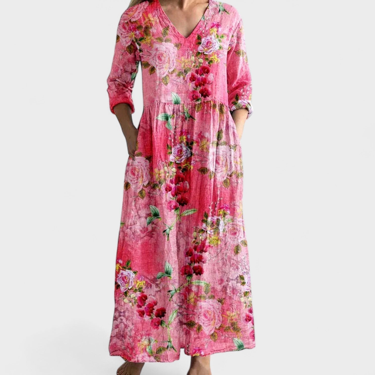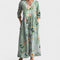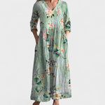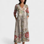 Rahatlığı ve zarafeti bir araya getiren bu elbise, doğadan ilham alan çiçek desenleriyle ruhunuzu yansıtır. V yaka detayı, üç çeyrek kolları ve cepli tasarımıyla gün boyu konfor sunarken stilinizden de ödün vermez.
