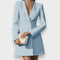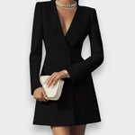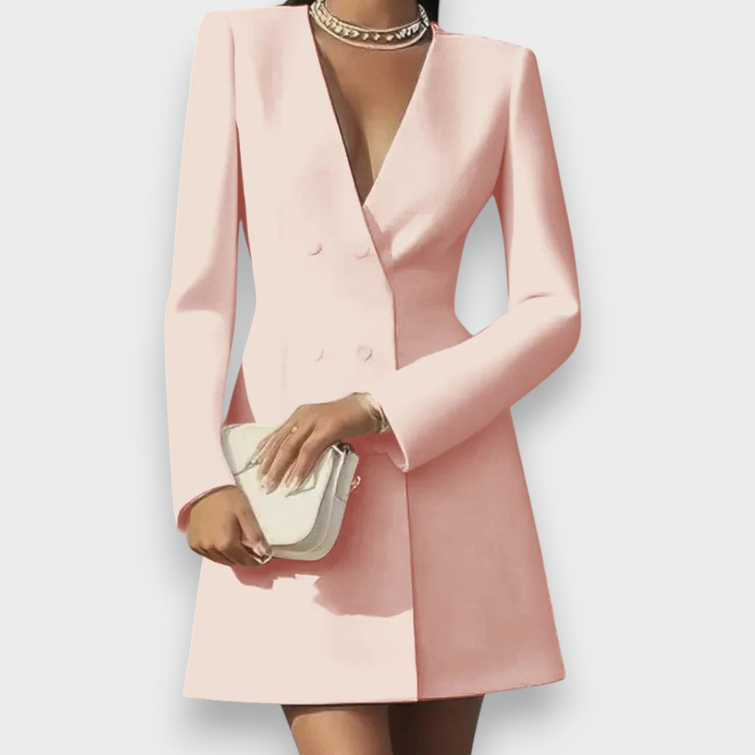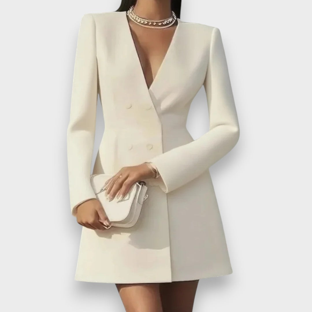 Feyza, modern çizgileri zarafetle buluşturan belden oturtmalı mini elbisedir. V yaka, uzun kol ve çift düğmeli ön tasarımıyla şehirli bir şıklık sunar; ister akşam yemeği ister özel davet olsun, görünümünüzü zahmetsizce yükseltir.