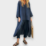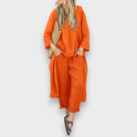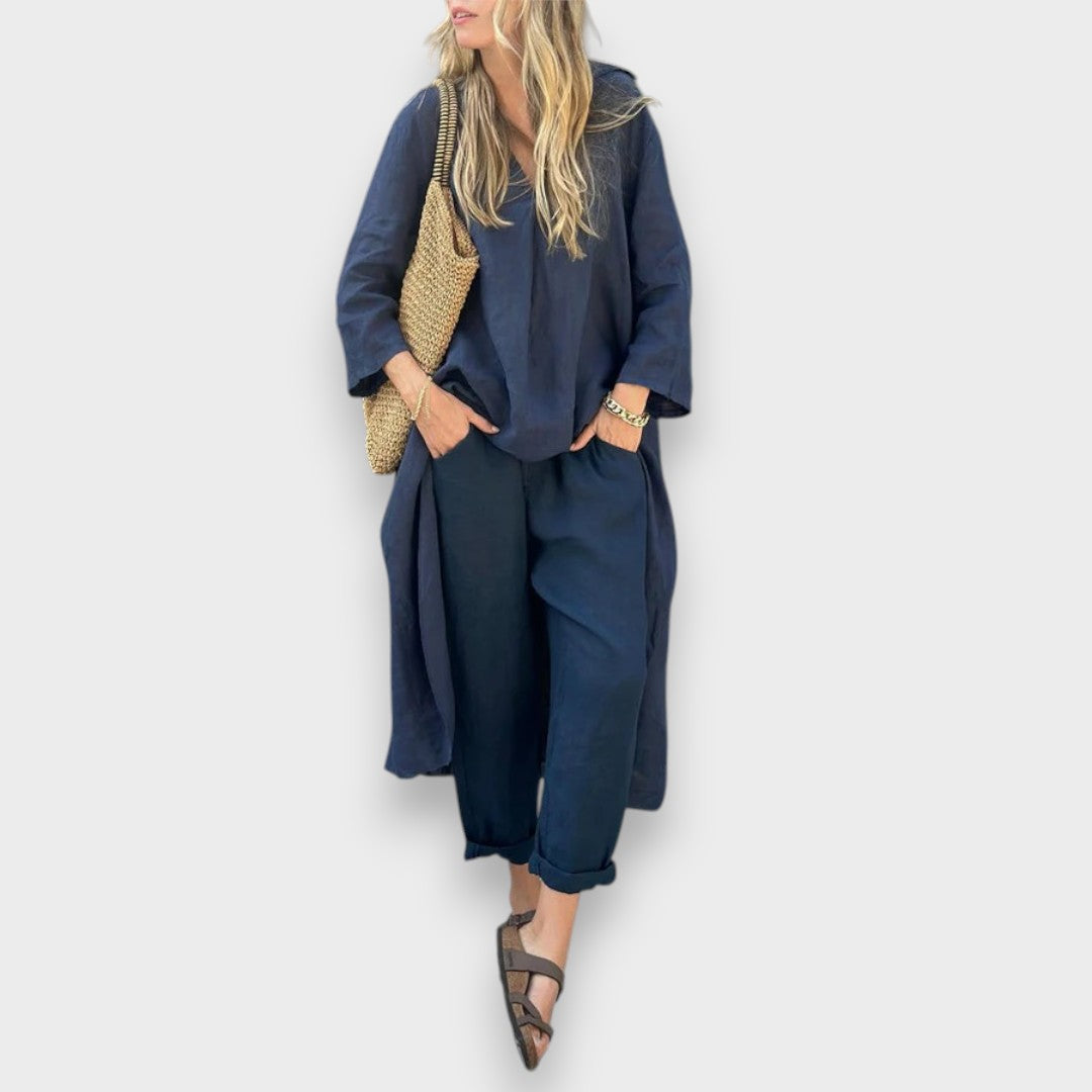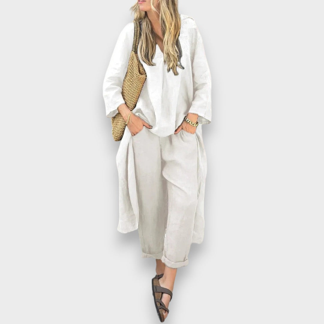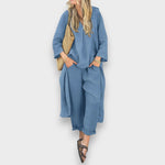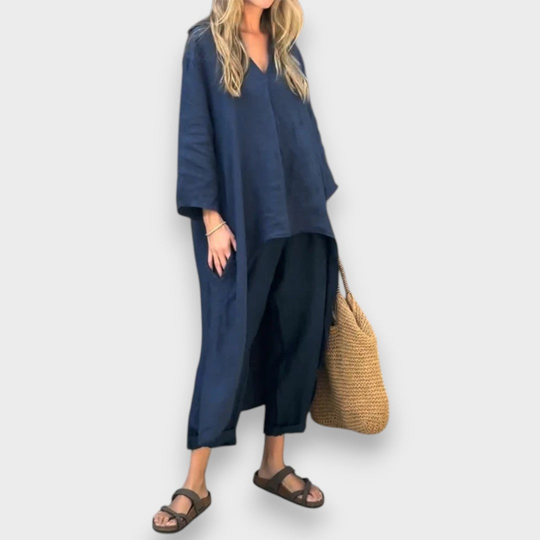 Bu zarif iki parçalı takım, ilkbahar ve yaz günleri için ideal bir seçimdir. Hafif ve nefes alabilen kumaşı sayesinde gün boyu ferahlık ve konfor sağlarken, şık tasarımıyla brunch buluşmalarından akşam davetlerine kadar her ortamda sizi öne çıkarır.