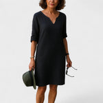 Düz kesimiyle bu elbise, sade ama etkileyici bir şıklık sunar. V yaka detayı ve 3/4 kol boyu ile vücuda zarifçe oturur, farklı vücut tiplerine uyum sağlar.