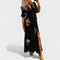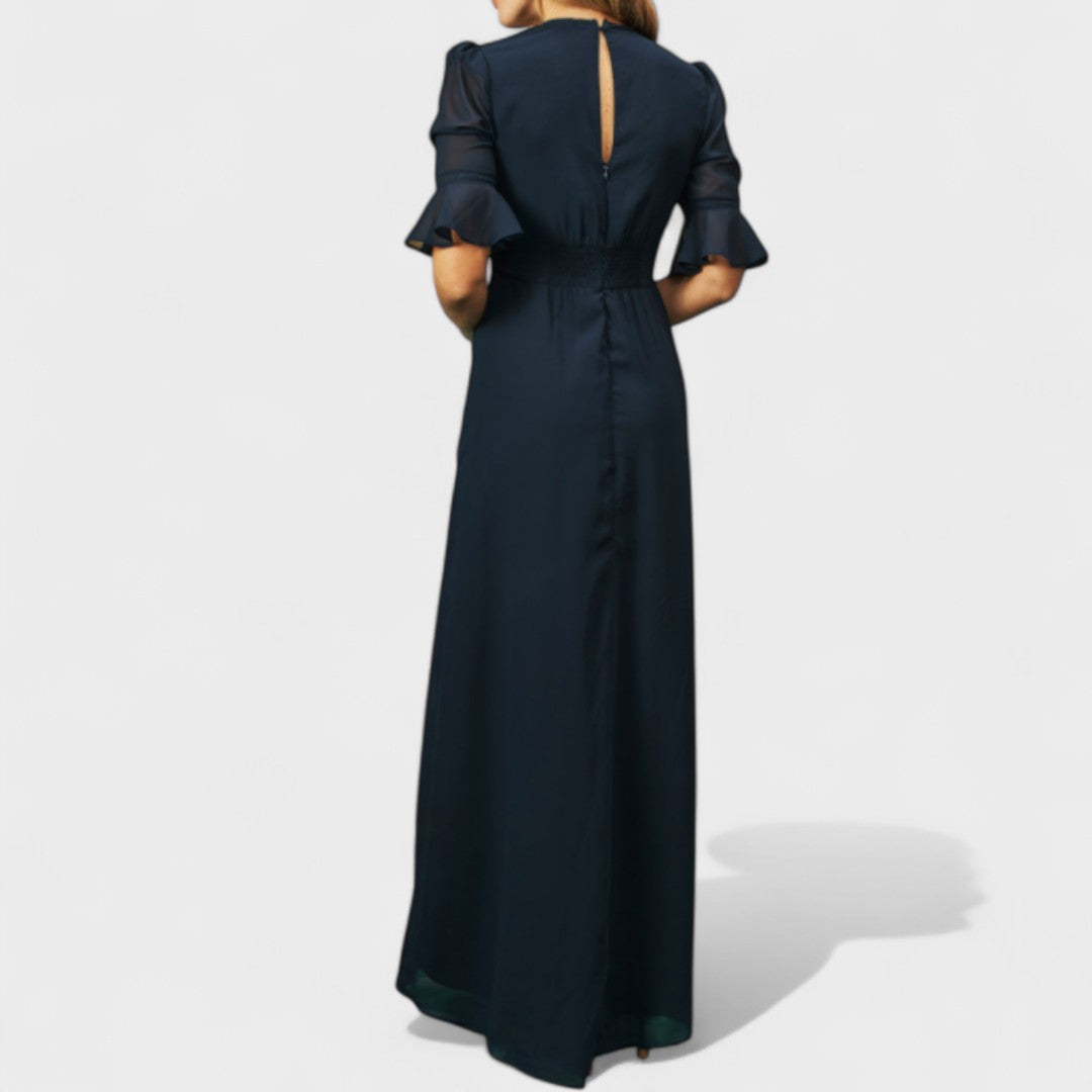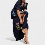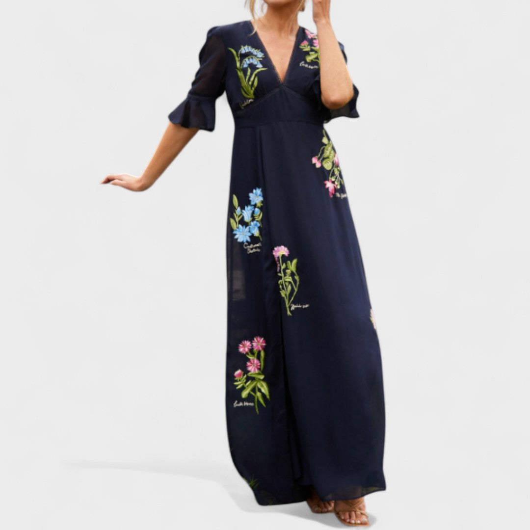 Bu uzun elbise, zarif çiçek işlemeleriyle romantik ve sofistike bir görünüm arayanlar için mükemmel bir seçimdir. Akıcı kesimi ve yırtmaç detayı sayesinde silueti zarifçe vurgular; volanlı kollar ise feminen ve şık bir dokunuş katar.