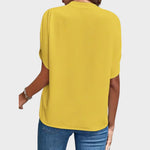Modern kesimi ve sade şıklığıyla öne çıkan bu bluz, gardırobunuzun vazgeçilmezi olmaya aday. V yakalı ve zarif yaka detayıyla feminen bir duruş sunarken, özgürce hareket etmenizi sağlayan dökümlü kollarla rahatlık da garanti.